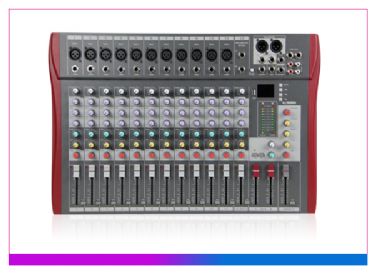 ●超薄型设计,12路单声,通道三段均衡,一组辅助发送,一组效果发送,内置数字效果器,60mm精密推拉电位器